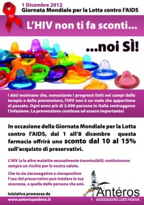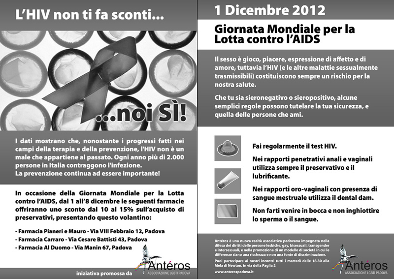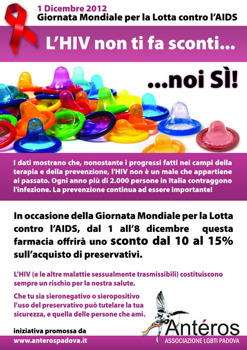 Moltissimi giovani non sono informati, secondo un’indagine condotta dal sito Studenti.it il 31% degli utenti dichiara di saperne poco o nulla. Anche per questo l’associazione Antéros ha lanciato una campagna che avvicini i giovani, e i meno giovani, all’uso del preservativo attraverso l’adesione di alcune farmacie padovane. In queste farmacie dal 1 all’8 dicembre verrà praticato uno sconto dal 10 al 15% sull’acquisto di preservativi, presentando il volantino che verrà distribuito nei prossimi giorni dai volontari di Antéros. Il volantino avrà lo scopo di informare anche sulle linee guida più riconosciute per la prevenzione dall’HIV.