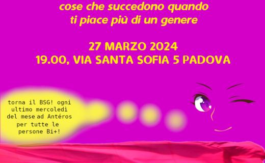Torna un progetto a cui teniamo molto: iniziato nel 2018 in primavera, è un gruppo di supporto per le persone bisessuali, che non sempre sono accolte per davvero: “Quellə di noi che amano più di un genere e/o più di un s3sso usano differenti etichette, ma condividiamo un’esperienza in comune: la nostra presenza mette le persone a disagio, esistiamo in zone grigie, zone che a volte vengono definite non abbastanza gay, a volte non abbastanza etero. Se siamo in una relazione monogama veniamo vistə come se avessimo scelto uno dei due schieramenti, se siamo poliamorosə veniamo vistə come dannosə per la causa. La nostra stessa esistenza è una minaccia alla etero-normatività e al binarismo di genere…”.