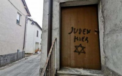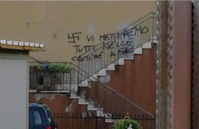 In basso, alcune scritte comparse in Italia in tempi recenti: una è su una abitazione ove vive una coppia omosessuale e riporta una svastica con la frase “vi metteremo tutti nelle camere a gas”, l’altra è in tedesco e dice “ebrei qui”.