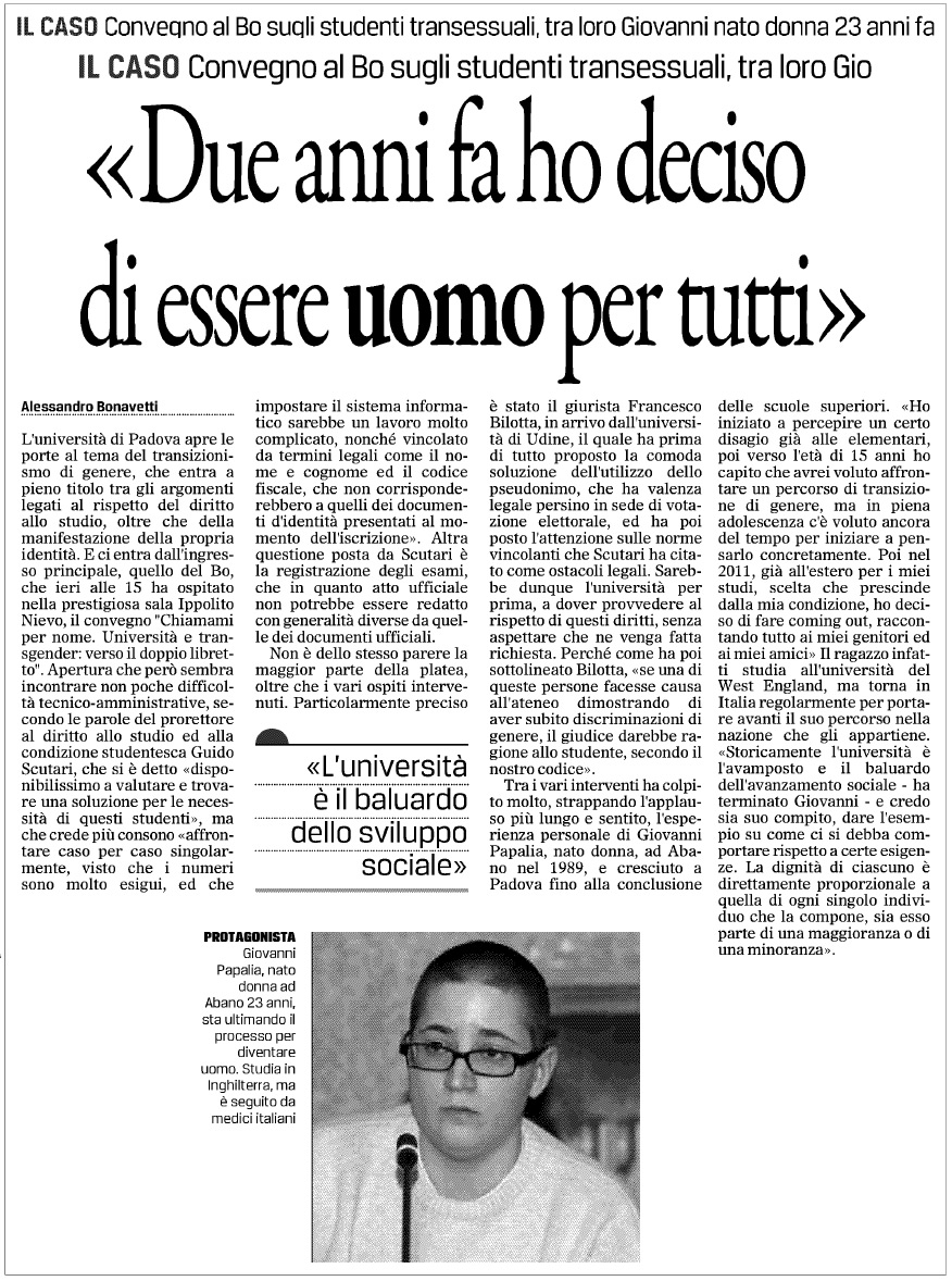 Il Gazzettino di Padova – “Due anni fa ho deciso di essere uomo per tutti”
